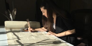 Soferet Alex Casser does work on MST Scroll #3 in her studio in Alexandria, VA in 2019.