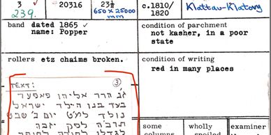 Index card describing the condition when the Czech Scrolls were brought into the Westminster Synagogue in 1964.
